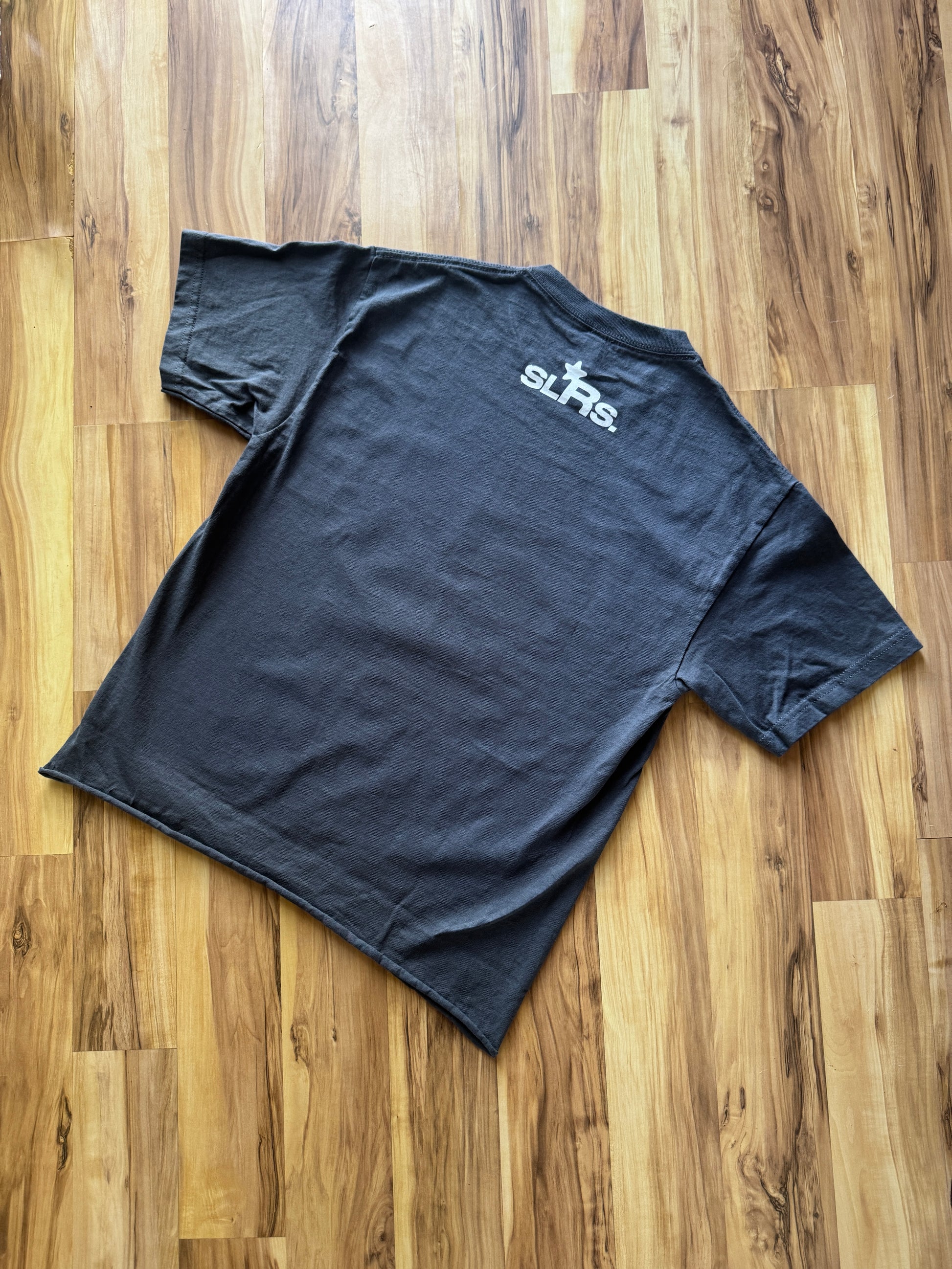 This tee has been cropped an inch. Therefore having a raw edge bottom.